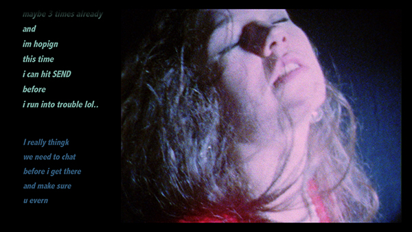 除此之外,“我”的被动还体现在当独白不再以声音的形式出现,而是以文字的形式出现时,语言的力量在瞬间增强。这不仅仅是形式上的增强——它不以听的形式而出现,却占据了视的领域——更是其本身表达性的增强。尽管艺术家为我们提供了一个画面,然而文字仍然在画面之外制造着画面。画面和文字同时在挖空我们的想象——我们在身体和情感上试图感同身受,我们在情理上试图追根溯源。虚构因此充满画面,同时还溢出了画面。